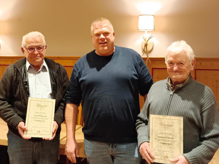 Im Rahmen unserer diesjährigen Jahreshauptversammlung am 10.04.2026 im Kirchberger Rasthof wurden zwei neue Ehrenmitglieder ernannt. Der Vorsitzende Tobias Hornung betonte, dass für den Erhalt dieser Ehre neben einer 50-jährigen Mitgliedschaft ein besonders aktives Engagement für den Verein und die Kleintierzucht Grundlage sei. Anschließend würdigte er das jahrzehntelange Wirken von Paul Riethmüller und Bernhard Kratzer, die seit 1976 Mitglieder des Vereins sind. Die Geehrten haben sich zudem nicht nur durch erfolgreiche Zuchtarbeit, sondern auch durch ihren unermüdlichen Einsatz bei Ausstellungen, Jugendförderung und Vereinsveranstaltungen verdient gemacht.